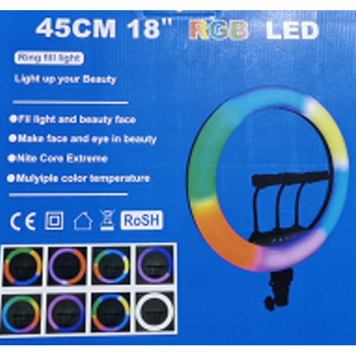 Кільцева лампа RGB 45CM — ідеально підійде візажистам, стилістам, стилістам-парикмахерам, блогерам. Selfie кільце підходить для відео, фото, Selfie. Підходить практично під будь-який штатив або триногу. Застосування такої лампи обмежиться тільки вашою фантазією! Компактна гнучка лампа з власником для телефона не тільки освітить знімання, а й звільнить руки від телефона, а універсальна прищіпка дасть змогу встановити кільцеве світло будь-де.