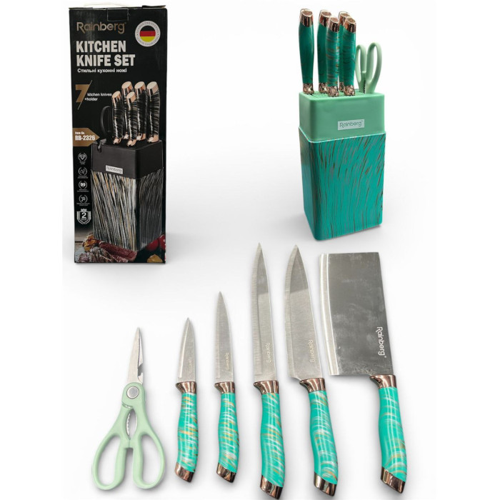 Набір ножів із неіржавкої сталі з підставкою Rainberg RB-2326 — — це поєднання елегантного дизайну та високої функціональності. Стильні мармурові ручки із золотистими акцентами мають вишуканий вигляд, а зручна підставка забезпечує компактне зберігання всіх елементів. У наборі 7 предметів: 5 кухонних ножів для різних завдань, ножиці та фірмова підставка.