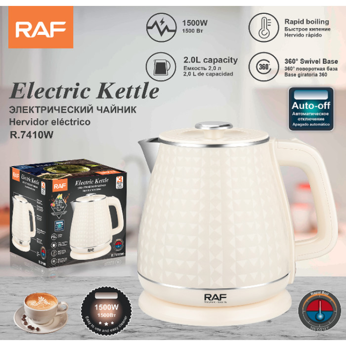 Электрический чайник RAF R.7410 1500W 2L - это современное устройство, предназначенное для быстрого и удобного кипячения воды. Объем чайника составляет 2 литра, что позволяет приготовить горячие напитки для всей семьи или небольшой компании.